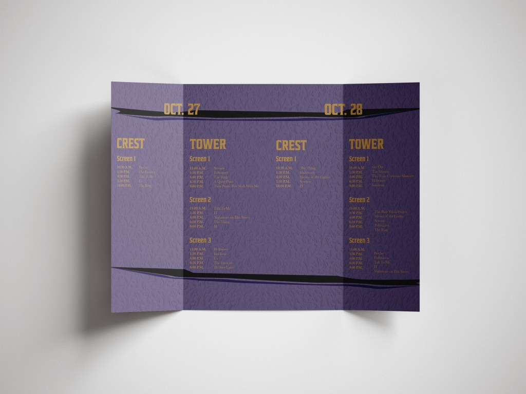 While at the film festival, the audience can grab a brochure. The brochure lists out the three days, and which movies are playing on each screen. Each screen also includes times and at which theatre a film will be played at. The front of the brochure includes the image of the mirror with hands coming out. As you open the brochure, it invokes the feeling of going into the mirror.