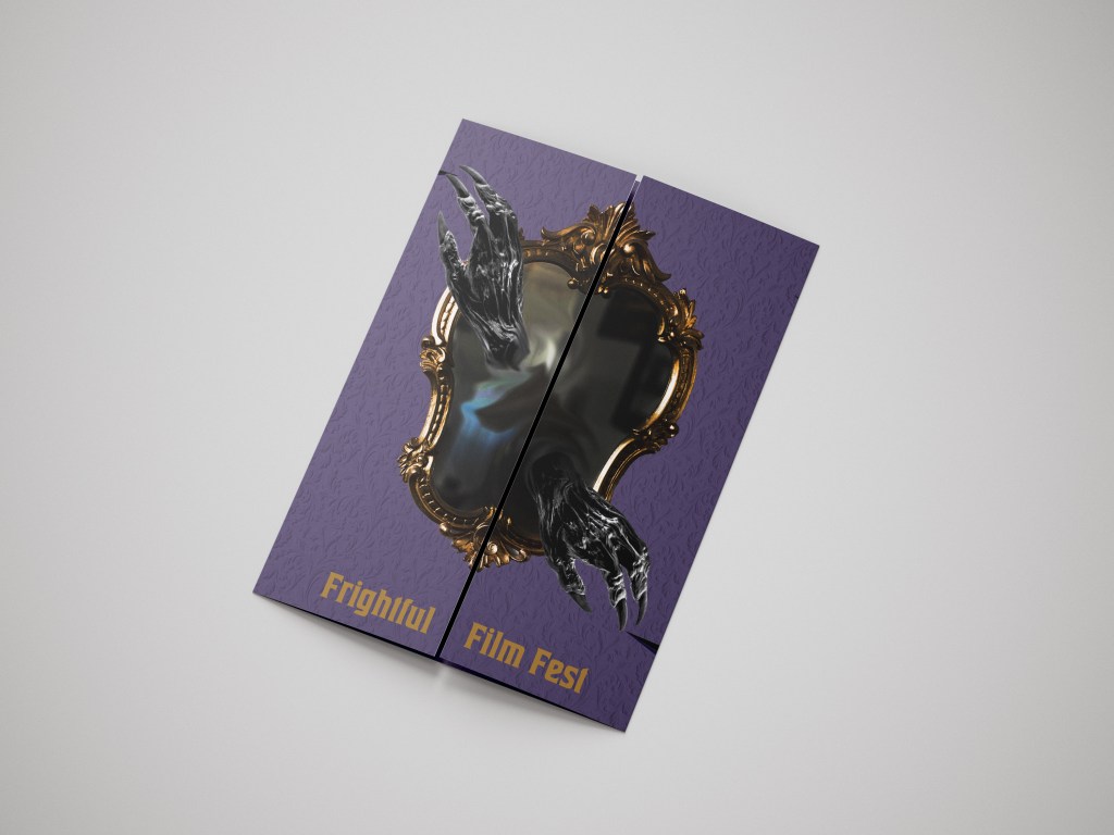 For this film festival, a VIP invite is also handed out to potential attendees. The VIP is an interactive card that the recipient can open to learn more about the event with information, such as the event title, locations, and dates. The front flap depicted an object covered by a cloth. As the viewer lifts up the flap, a golden ornate mirror is revealed. The revelation of the mirror with eyes is homage to the horror trope of haunted antique objects in horror films often being covered with a cloth. The writing, “WE ARE WAITING FOR YOU,” at the bottom of the invite further emphasizes that the viewer is being watched at every moment.